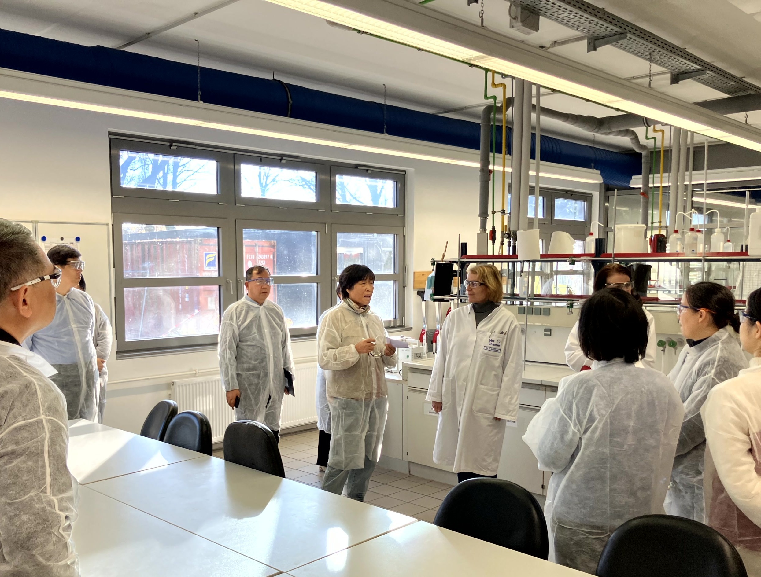 Am Nachmittag stand eine praxisorientierte Führung durch die Laborbereiche des bbz Bildungswerk Nordostchemie e. V. auf dem Programm. Unter der Leitung der Fachdozenten Ole Möbius (Pharmazie) und Carsten Johann (Biologie) erhielten die chinesischen Lehrkräfte Einblicke in die praktische Ausbildung, zum Beispiel zu folgenden Themen: Tablettenherstellung, Überzugstechniken in der Pharmazie, mikrobiologische Analysen von Luft- und Wasserproben, Demonstration der Anwendung von RT-PCR im Rahmen der modernen Molekulardiagnostik.